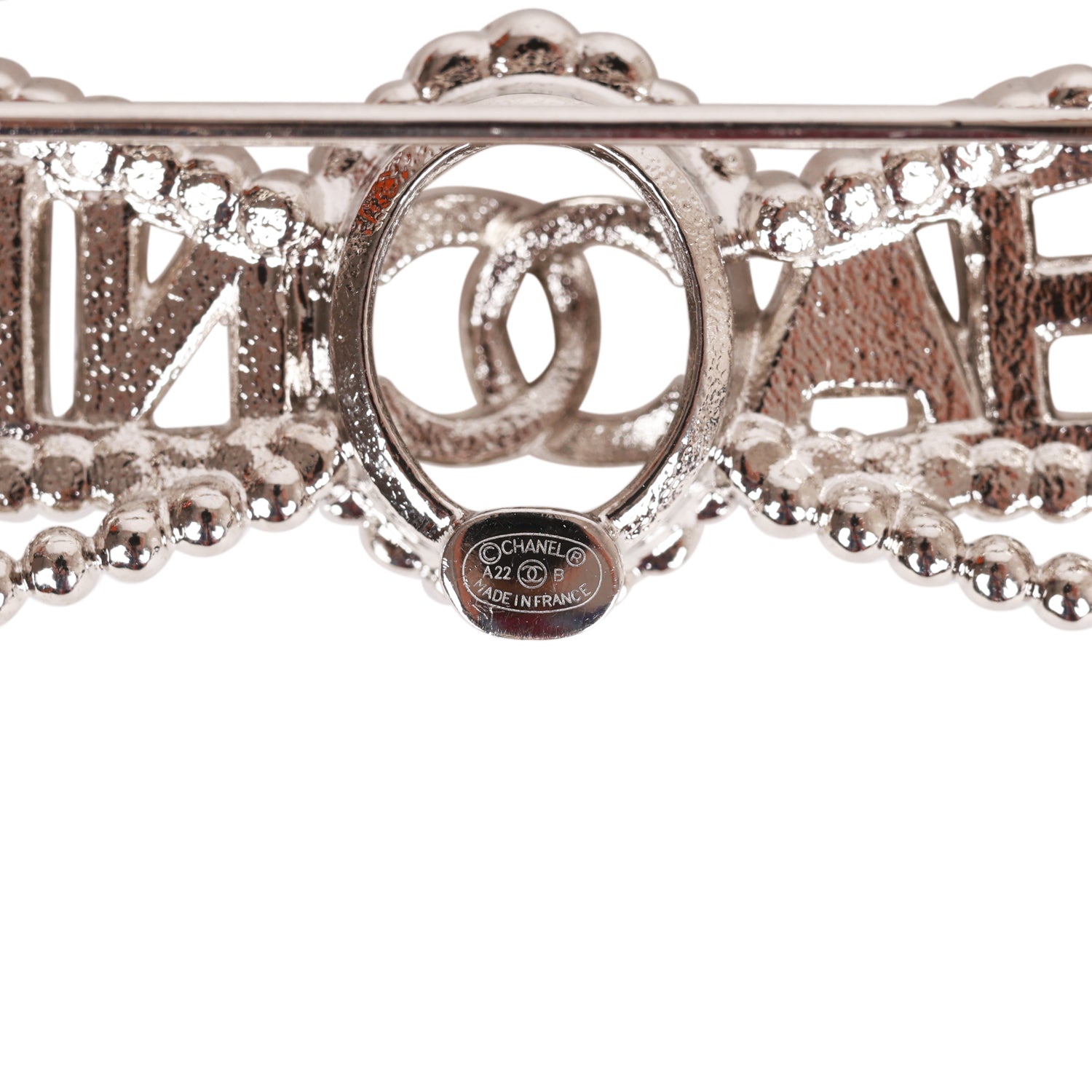 This brooch is in silver tone metal with clear crystals on the CC logo and also spells out CHANEL in the shape of a bow.